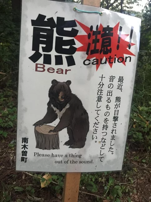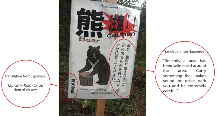 In addition, we asked a native speaker of Japanese to translate the Japanese text for us. The writing on the right reads as follows: “Recently, a bear has been witnessed around the area. Carry something that makes sound or noise with you and be extremely careful.”