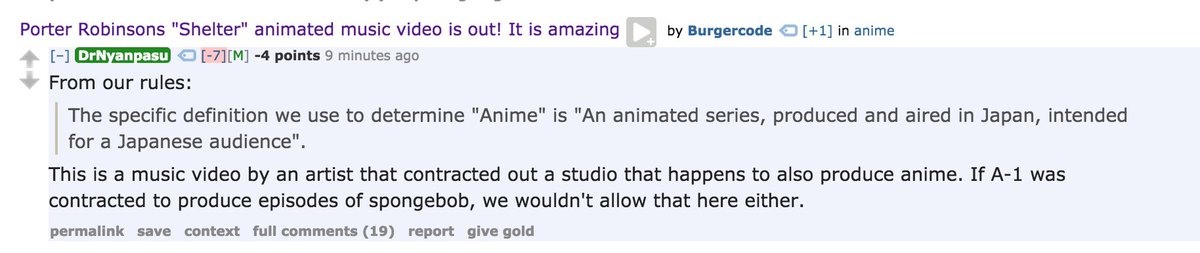 “The specific definition we use to determine "anime" is "an animated title, produced and aired in Japan, intended for a Japanese audience". This is a music video by an artist that contracted a studio that happens to also produce anime. If A-1 Pictures was contracted to produce episodes of SpongeBob, we wouldn’t allow that [on the anime subreddit] either.” (DrNyanpasu, 2016)