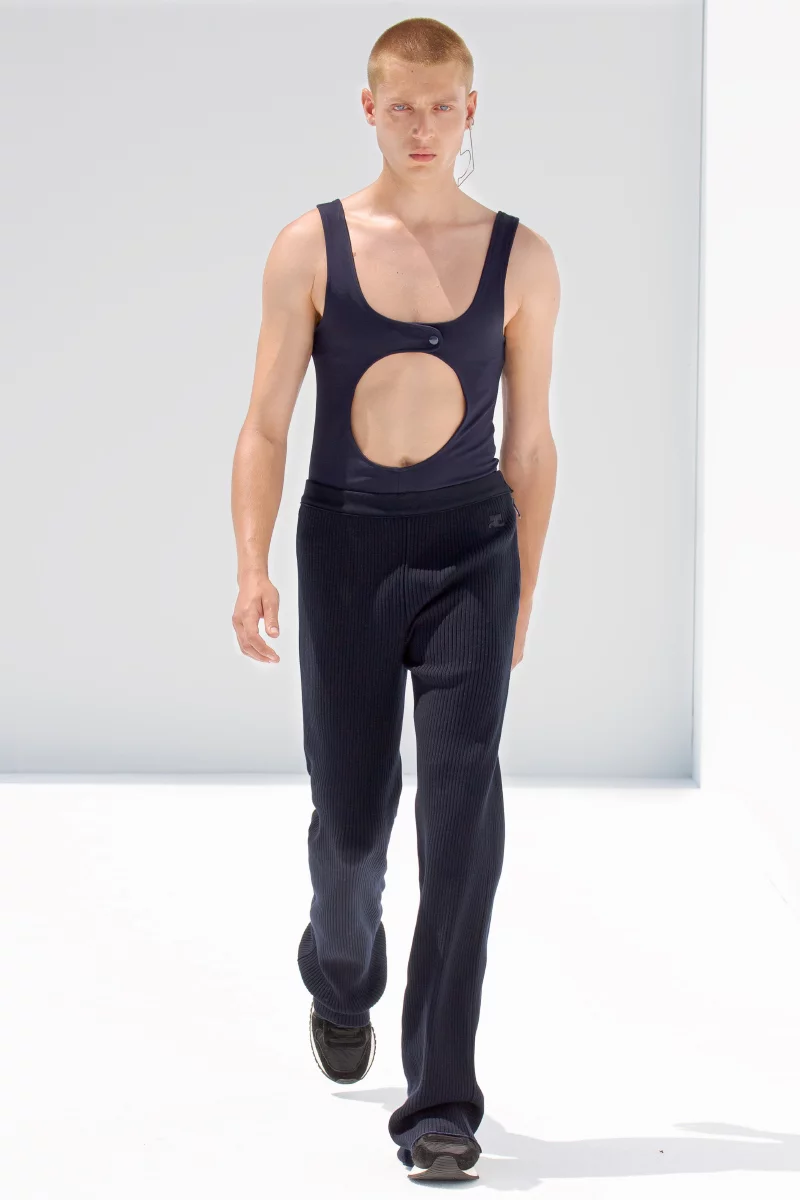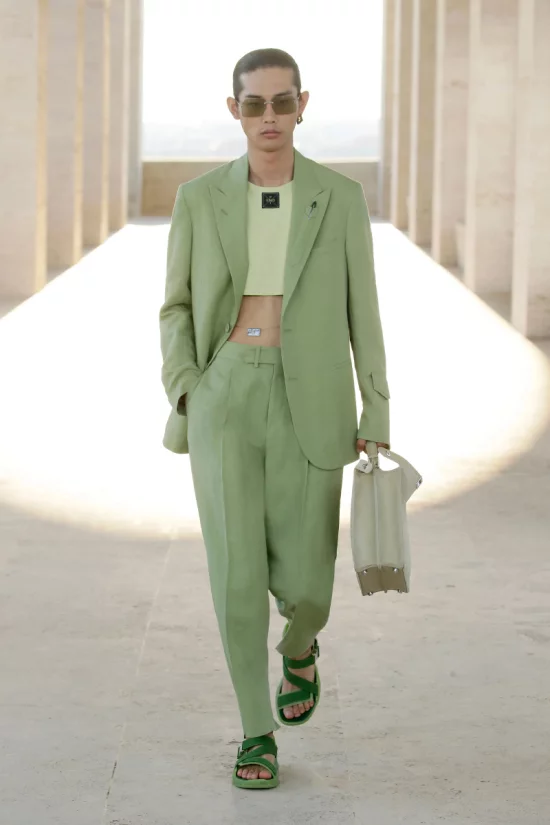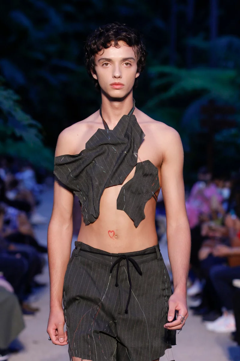 For example, in this collection, showing the lower part of the body like the traditional crop top is often associated with the female gender in “mainstream” clothing. The model also has a form of jewelry around the waist, presumably to emphasize the lower part of the body. Also, note the use of a handbag which used to be a key aspect of the female gender within the fashion world.