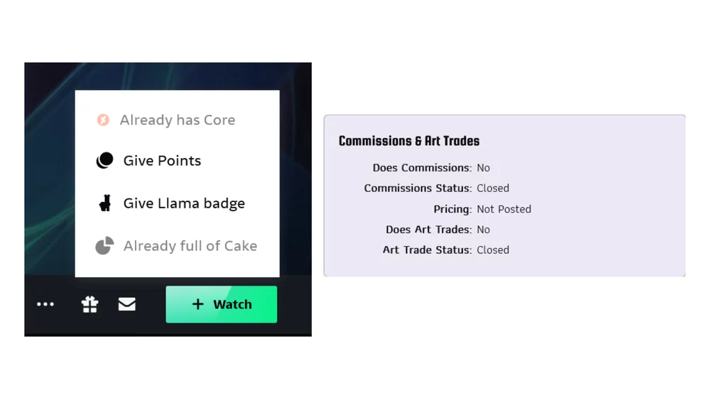 With different gifting and funding options, there arethere’re more nuances to ‘playbour’. On DA, users can gift artists free ‘Llama’ badges, and pay for a cake badge or a Core membership. Incentivized out of appreciation, ‘gift economy’ is seemingly at play, but with them proprietary to DA, they are “a formal and abstract kind of token” (Scholz & Wark, 2013, p.73) rewarding their active maintenance on their portfolios. Meanwhile, commissioning custom art is possible on both Side 7 and DA, plus the possible ‘art trades’ between artists, this tends to be ‘waged labour’ more than modders (Kücklich, 2005).