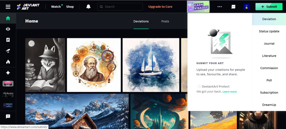 First, DA’s interface provides a convenient shortcut to a different worldview. Positioned at the top right-hand corner, the Submit button’s bright greenbright-green colour contrasts with the default black background, and redirects to another page for posting images. The + sign on it can be seen as adding your valuable take and spark an exchange of ideas amongst like-minded people, especially when it can be done unlimited times. Plus, its drop-down menu labels possible formats users can upload to the platform with outer-space themed illustrations, like portraying Status Update with an astronaut transmitting signals. Combined with the green colour scheme, this presents DA out of the mundane and a portal to where creative minds take the stage – the central theme behind their relaunch.