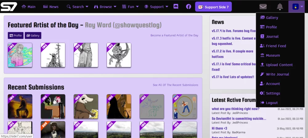 Meanwhile, Side 7 doesn’t emphasize uploading artwork, but showcases a friendly atmosphere to budding artists. Unlike DA’s eye-catching placement, the upload button is listed in the drop-down menu of the user profile with descriptive icons, although there used to be a simpler method.