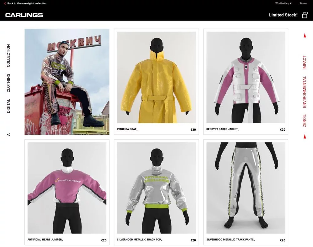 The Scandinavian fashion brand Carlings launched their digital collection in 2018. (See figure 1) They were one of the first brands to launch clothing you can't technically wear. The clothing had an average price point of $20 per item and upon purchase you had to send them a photo on which the item was digitally edited. Afterwards, the picture is posted on Instagram and you can show off your new fit to your followers. You don't even need to get dressed.