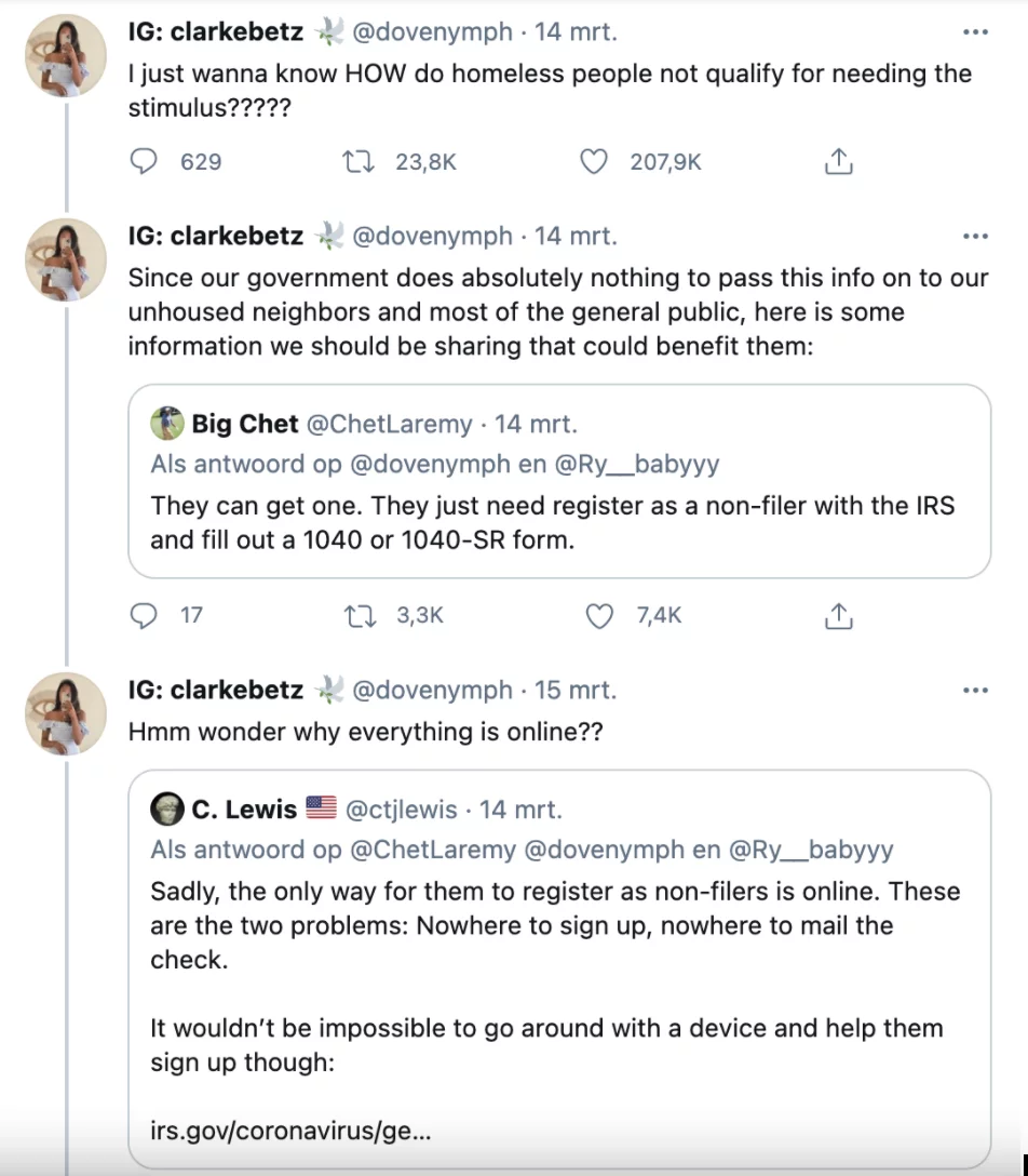 Another problem was that the check could not be mailed anywhere, as the people signing up had no individual address. Also, when stimulus checks were announced,  homeless people also had the right to this check was not clear. Many homeless people were not even aware of this fact until after the stimulus checks were sent out. When multiple viral tweets about people experiencing homelessness being eligible for the “stimmy” went viral, people started to take initiative by actively helping the homeless get their stimulus checks  raise awareness for the country wide problem of homelessness.