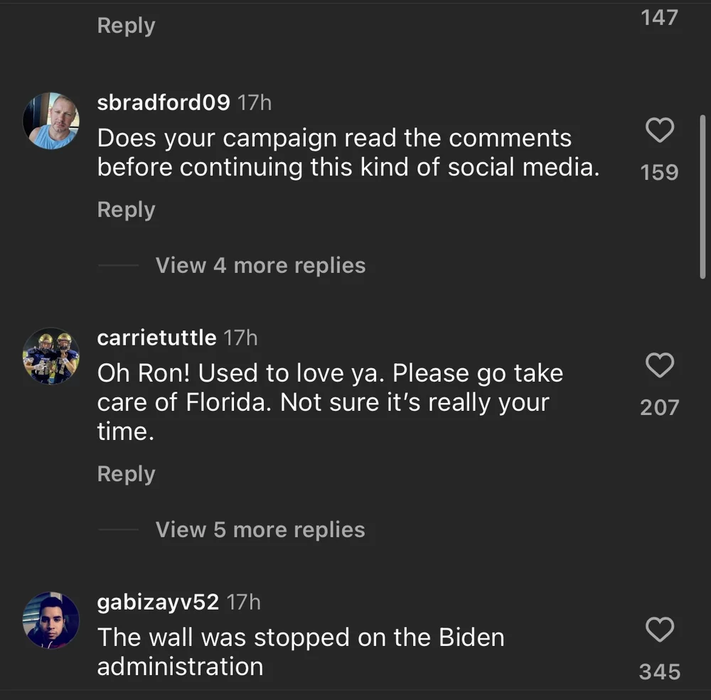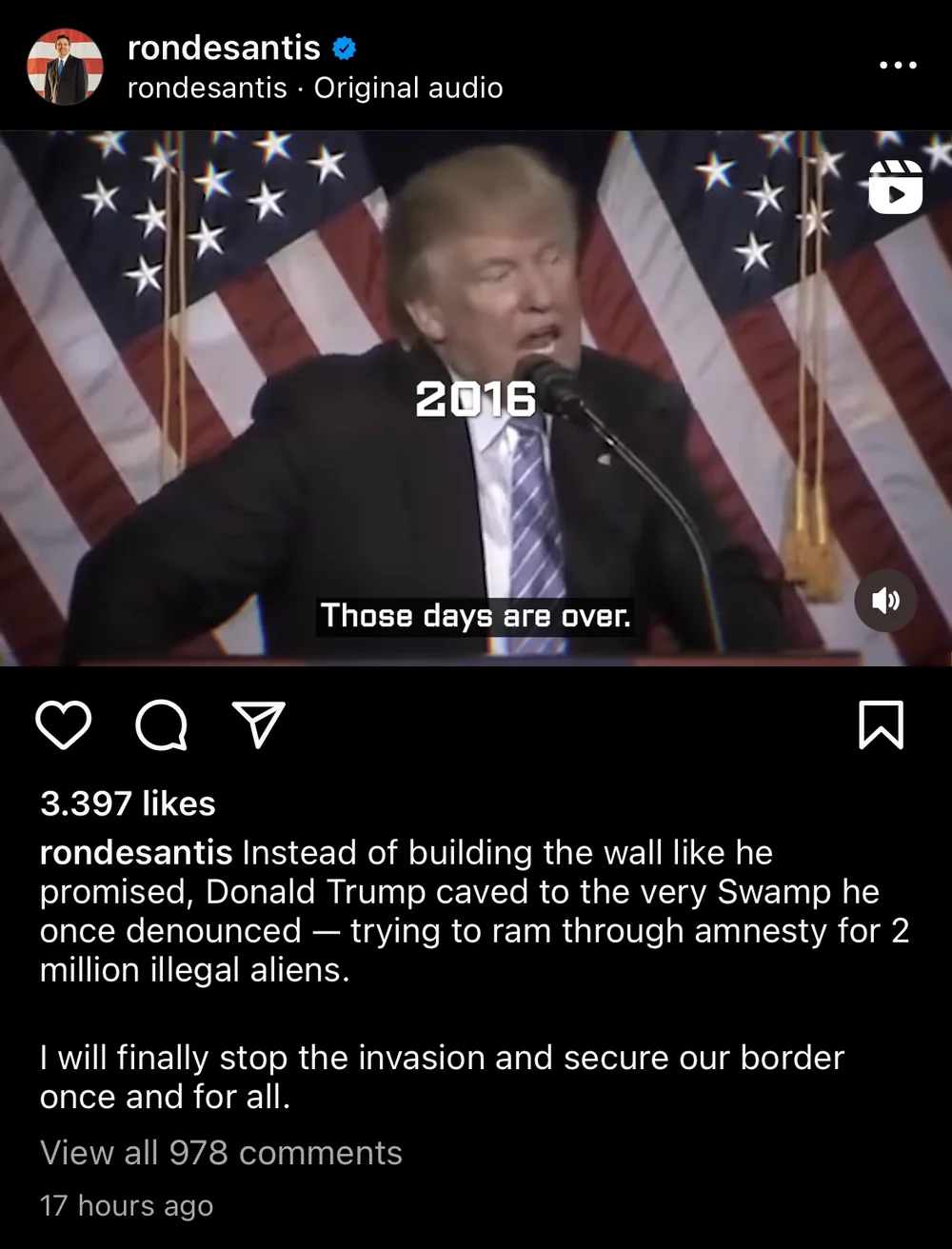 Since then, it has received 3,397 likes as well as 978 reactions. The reaction under the Instagram discourse is not pleased with the campaigning of DeSantis, reading "Oh Ron! Used to love ya. Go please take care of Florida. Not sure it is your time" as well as "The wall was stopped by the Biden administration". The reactions imply that the campaign placed on Instagram may not be the most relevant next to being 'off message', since it does not reflect the "Trumpian" thoughts in the desired degree.