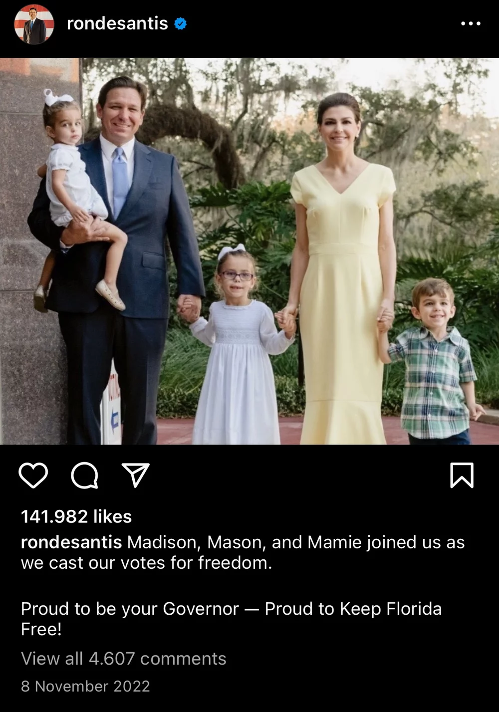 The Florida Governor is presented on Instagram by his social media team as a family-oriented politician supporting personal freedoms. He wears formal clothing, and whilst he stands with his family in the mentioned photo, he stays formal, his political message clear on supporting personal freedoms for the people of Florida during his governance.