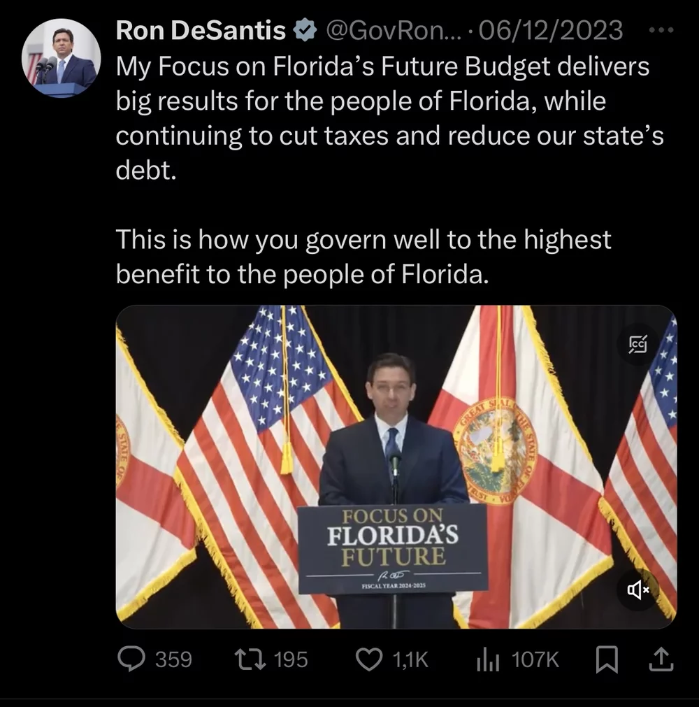 Within the presented Twitter communication produced by his media team, Ron DeSantis's populist discourse is reflected in his ideas about a favorable political and economic future for the people of Florida. Stating "big results for the people of Florida'', he steps up as the "hero" of Florida, promising the people of Florida lower taxes whilst reducing the state's debts, which is an act that may lead to being considered popular as the wishes of the people may be heard by the Governor- who is taking action to "highest benefit the people of Florida".