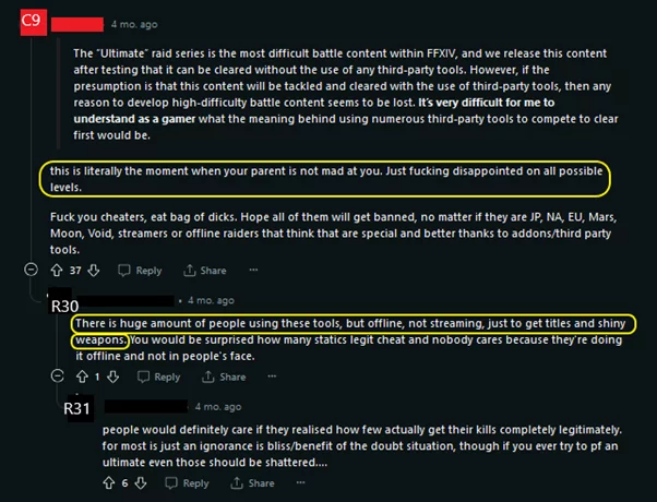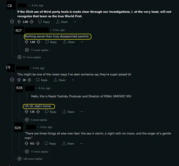 On Reddit, a wide debate amongst the community sprung up, with users discussing the worth of the “World First” title. Not only did the community speak up through platforms like Reddit, but even the creator of the game, Naoki Yoshida, wrote a public post about this incident and the use of third-party tools in his game (Yoshida, 2023).