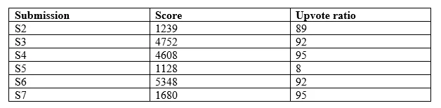Table 1 presents an outline of the scores of the posts, as well as their upvote ratios. These provide us with information about how the community received the original submission, as well as how popular the post was in general, meaning how many community members might have seen it and thus would have been able to interact with it.