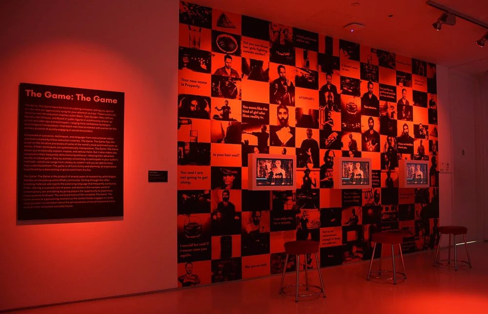 A project called The Game: The Game, developed by an artist Angela Washko, is a dating simulator game based on the author’s research into online pick-up artists, which is available online but was also debuted as an exhibition in New York’s Museum of Moving Image and later in other museums as well (The Game: The Game, n.d.). The game's setting is a first-person experience of being a woman during a night out in the club, as the main character gets approached by one ‘pick-up master’ after another. The atmosphere of the game is meant to be unsettling; the music by the band Xiu Xiu sounds like it came straight from a slasher, and the art style looks eerie, all to accompany the distressing nature of ways the different men in the club approach the main character. The player is in charge of how the main character responds to the aggressive flirting they are met with from the men, choosing to either outwardly refuse their advances or play along to see through their strategy and witness the intentions behind their ways of behaviour.