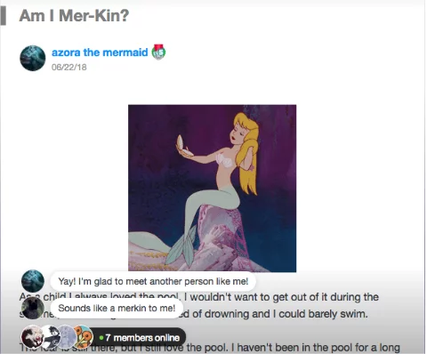 The Mermaidkin communities on AminoApps talk a lot about what it means to be a Merkin and what kind of characteristics you should have. For example, ‘Azora the Mermaid’ shares her experience and asks others whether she is a Merkin or not. Azora says that she always misses the water when she is not in it, that she feels magical when her hair is floating around in the sea, and that she wishes to be able to breathe underwater (Azora the Mermaid, AminoApps, 2018). Other Merkin react and assure her that she is, indeed, a Merkin. (See image below).