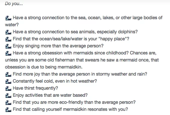 The way you feel is very important. There are lists on AminoApps that can help you determine whether you are a Merkin or not. These lists ask you if you ‘find yourself homesick or longing for the ocean frequently,’ or if you ‘have a calling to protect the world’s oceans and other bodies of water,’ and other examples. (Mal, AminoApps, 2018).