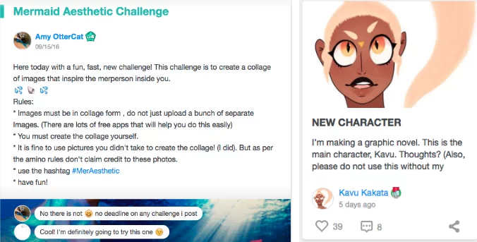 Mermaidkin uses AminoApps to create and maintain a feeling of home and to be one big family. This means that there is not one powerful person or group that creates the norms or rules, but anyone can participate. For example, anyone can create blogposts and challenges (AmyOttercat, AminoApps, 2016; KavyKakata, AminoApps, 2018).