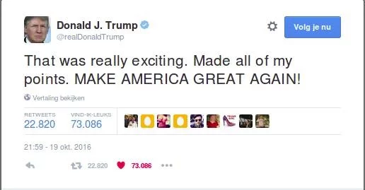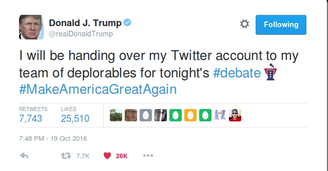 Trump, with his parler vrai, constructs an aura of 'realness' around his discourse. His dares to be politically incorrect, which produces the idea that he is 'really' himself. He is seemingly sincere in his speech and message. He brashly says what he thinks, even if this creates commotion. One by-product of this parler vrai is that his Tweets are scrutinized and get mass-media attention. Management of visibility, in the context of Trump, means 'creating good controversy'; controversy that sustains his image of being 'anti-establishment' (Maly, 2016). On the night of the third debate, he handed over his Twitter account to his 'team of deplorables'. He managed to be visible not only on the television, but also on Twitter. Before we analyze the social-media-posting further, two points deserve our attention: