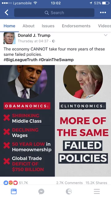 His Facebook account, just like his Twitter account, was handed to his team. This team must have consisted of a significant amount of people in order to manage all the posts and videos which were going online. The presidential campaign battles grew massively and took over the field of social media. One example demonstrating this is the hashtag usage. This action is not as popular on Facebook as it is on Instagram and Twitter, but Trump and his team use the symbol on this social media as well in order to link his posts to the other social media. In the night of third debate, as mentioned above, many of Trump's posts on Facebook include the hashtag #DrainTheSwamp as well as on his Twitter account.