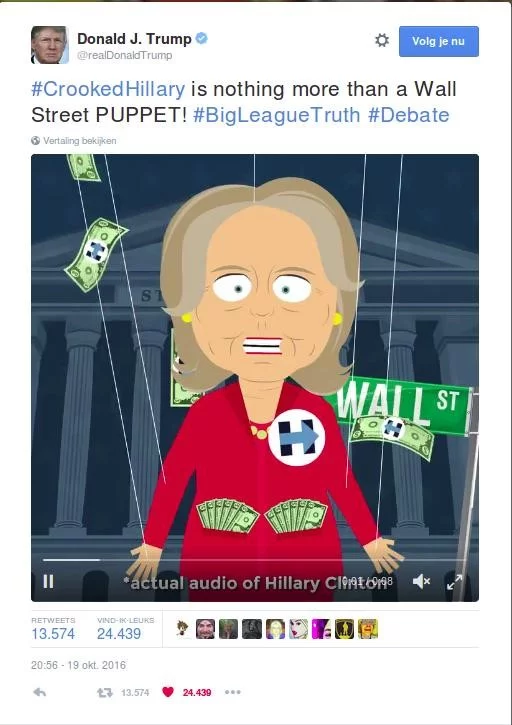 The message Trump's campaign is distributing is very consistent: he is the one that will clean up the mess. A political cartoon circulated in the days before the debate, that summarized Trump's message well. Trump is depicted as the one cleaning the swamp, and the swamp represents everything that is wrong with America according to him: Crooked Hillary, the failing (liberal) media, Soros, but also Republicans who do not support him. By using the above mentioned hashtags and hashtags such as #CrookedHillary and #DrainTheSwamp, there is an interaction with a big group of people. The people who are reacting and reproducing these tweets are mostly Trump supporters; the Hillary Clinton supporters do not bother to react on these accusations about Hillary Clinton. In fact, there is very little criticism on the tweets. All those slogans interact and target Clinton, but Clinton and her supporters seemingly don't engage in a discursive online war on Trump's terrain. This creates the idea that his message only gets support. The idea is further underlined by Trump, who after the debate posted some tweets with online polls where he was the winner of the final presidential debate.