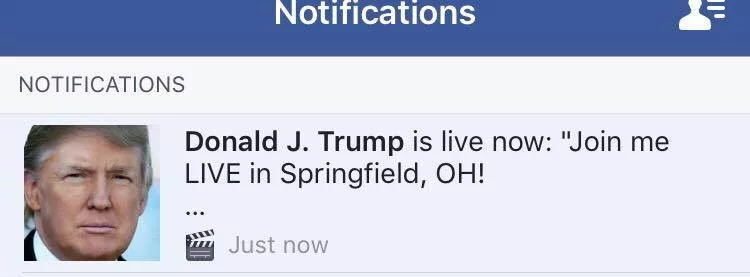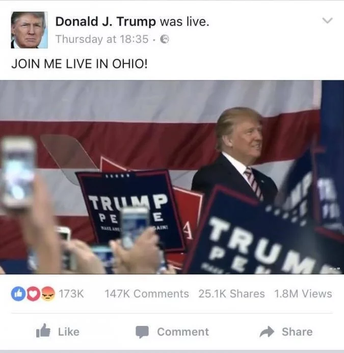 In comparison to the massive live video right after the debate, the next live video on Trump’s Facebook account is from Ohio. On Facebook, there is an option to create an 'event' to let all of your followers know where and when you are going to be. This makes the event even bigger, because all the followers from Ohio would know for it. As might be expected, Trump again went out this night with a message JOIN ME LIVE IN OHIO! He made it personal, and his video's look amateuristic, and one might say even more 'real'. Of course it is obvious that the video is recorded by somebody else. The numbers under the post are not as high as the video mentioned above, but it should not be underestimated. 173 thousand reactions, including like, love and angry; 147 thousand comments; 25 thousand shares; and the most significant number is that of viewers–over one million.