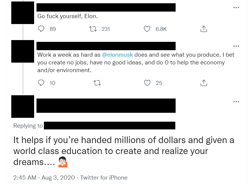 Interestingly, some proponents of Musk have taken it to themselves to defend him. One reply to the previous tweet is “Work a week as hard as @elonmusk does and see what you produce. I bet you create no jobs, have no good ideas, and do 0 to help the economy and/or environment.” This tweet falls into a type of theme—many defenses of Musk boil down to claiming that Musk is able to achieve more, ignoring the fact that Musk, as one of the richest people on earth, has vast resources at his disposal. Many of these tweets devolve into vicious arguments, as is visible above. In any case, Musk’s statements manage to rile up strong emotions, both negative and positive.