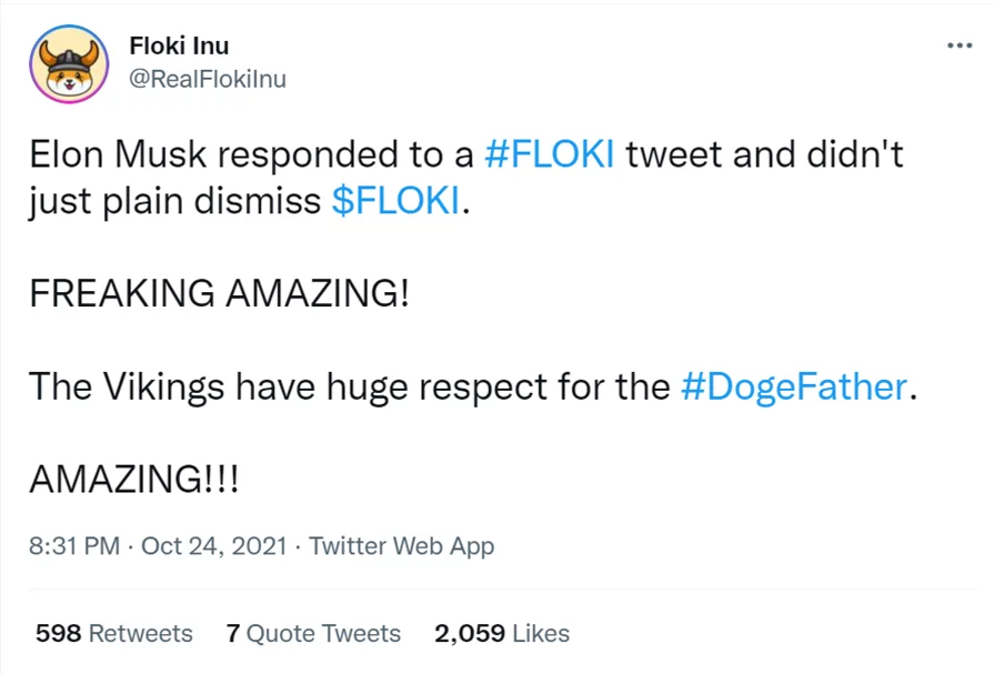 RealFlokiInu. (2021, October 24). Elon Musk responded to a #FLOKI tweet and didn’t just plain dismiss $FLOKI. FREAKING AMAZING! The Vikings have huge respect for the #DogeFather. AMAZING!!! [Tweet].