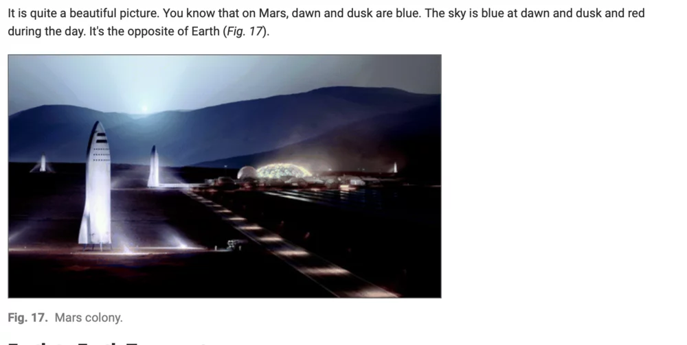 In the rhetoric used by Musk, going to Mars is presented in a pretty romanticized way. For instance, while the presentations are technologically-oriented, the tech entrepreneur talks about the color of the sky on the planet (see Figure 3). ‘Making Life Multi-Planetary’ and the SpaceX mission website both start with his quote: “You want to wake up in the morning and think the future is going to be great - and that's what being a spacefaring civilization is all about. It's about believing in the future and thinking that the future will be better than the past. And I can't think of anything more exciting than going out there and being among the stars” (Musk, 2018).
