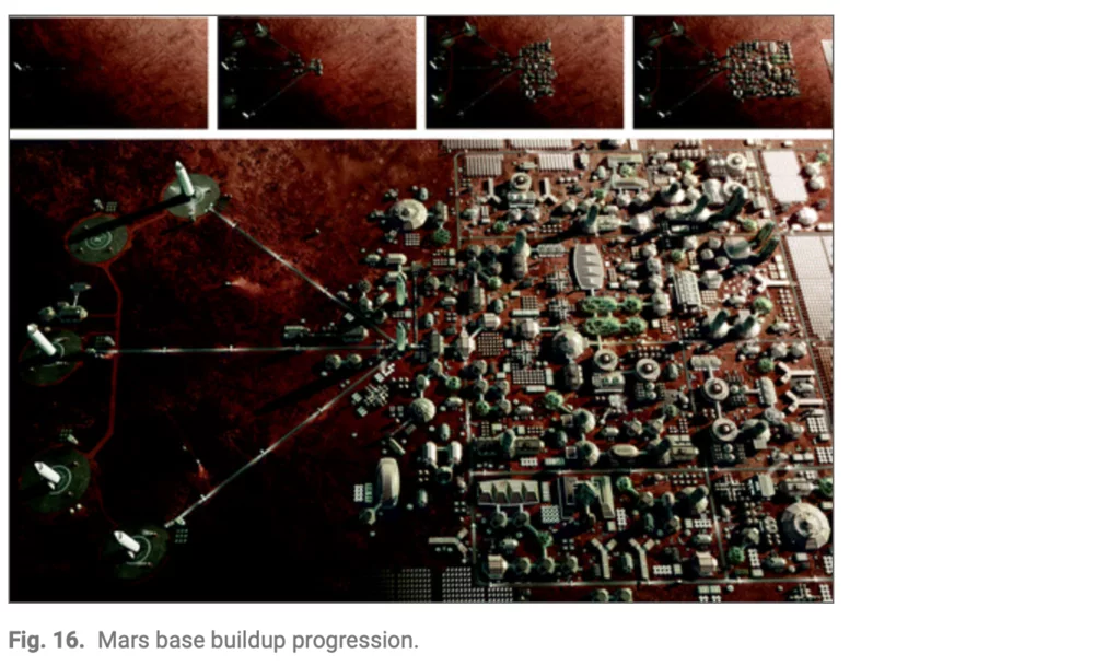 In fiction, life on Mars is often presented as a higher and more technologically developed form of society. Musk’s presentations of the colonization project feature imagery of futuristic-looking devices and strategies to help humans survive on Mars. Briefly, he presents his audience with plans of the creation of a “self-sustaining city—a city that is not merely an outpost but which can become a planet in its own right, allowing us to become a truly multi-planetary species” (Musk, 2017). The ambition is to build a Mars base that starts with one ship “then multiple ships, then we start building out the city and making the city bigger, and even bigger” (Musk, 2018). The presentation also features rich imagery of artistic vision of the Mars buildup progression.