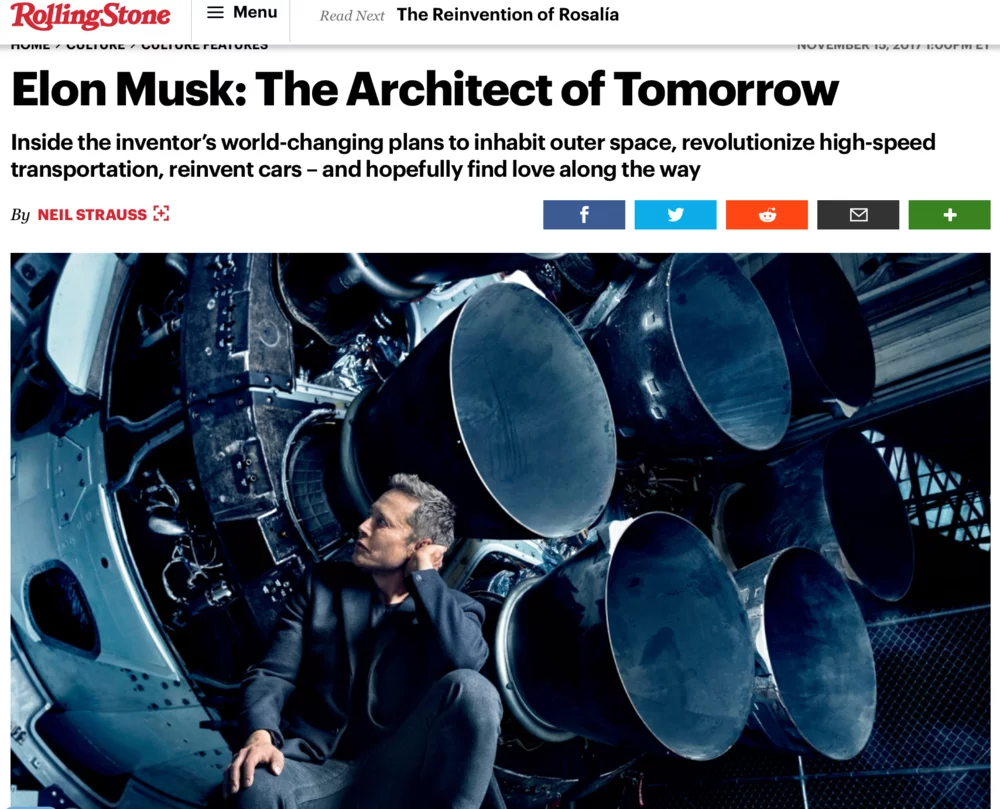 Elon Musk takes a key position as the representative and the media ambassador of SpaceX and its multi-planetary mission. Therefore, looking at his media persona means taking a glimpse at the ambassador of Mars inhabitation idea. When it comes to Elon Musk describing his plans he is often called ‘the visionary’,  ‘the architect’, and ‘the inventor’ of our collective future (see Figure 6). The billionaire's plans involve ideas that will need decades for realization. His media images reinforce the single inventor appeal as they often feature futuristic motives capturing Musk alone in front of rockets or gigantic machinery. Often, when the inventions of his companies are referred to, they address the tech boy and not the team of engineers and programmers working behind the scenes.