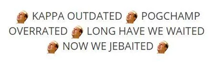 This sign is slightly less popular from the signs we have analyzed so far; it isn’t ranked amongst the top 30 most used Twitch emotes (streamelements.com, June 2017). It’s created from a picture of Alex Jebailey; a director of Super Smash Bros.Melee/Brawl tournaments, most notably Community Effort Orlando (CEO). Even though Jebaily plays the ‘Smash’ games at an amateur level he is known for having a huge ego which makes him a well-known figure. Jebaited was created as a word play on Jebailey, and is often used to describe the video game tactic of ‘baiting’, which comprises of leading people on or luring them into something. ‘Trolls’ use the tactic of ‘baiting’ as well when they try to make people react to them. The Jebaited sign is most notably used in the specific phrase or “copypasta” seen in Figure 9.