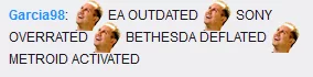 This variation phrase calls other videogame publishers, who at this point already have had a press conference, ‘outdated', ‘overated’, and ‘deflated’, while lauding this new Metroid game; ‘Metroid activated’. One interesting dynamic that is observed in this livestream, is that there usually is one figure that represents the streamer who communicates with the chat and vice versa. Since there is no one figure that represents the Nintendo stream, the chat is essentially mostly talking to itself, and in doing so creating a shared meaning and identity that through this phrase expresses disappointment with previous press conferences, a sound approval of the current one, as well as a self-confirming glorification of Twitch chat’s own identity and culture.