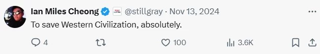 Thus, Eva Vlaardingerbroek operates within the algorithmic populism frame, positioning herself as a communicator with an anti-establishment discourse on behalf of the people. She leverages her understanding of her audience's concerns and disseminates her message using digital media infrastructure. Another significant aspect is that this comment is attached to a repost from a verified X account with the username @stillgray, which has 1.1 million followers. This account belongs to Ian Miles Cheong, a Malaysian right-wing commentator and social media influencer (de Guzman, 2024). Cheong and Vlaardingerbroek follow each other, and they share a lot of mutual followings: Elon Musk (who also follows both of them), Donald J. Trump, Viktor Orbán, etc. Cheong also replies to Vlaardingerbroek’s repost: