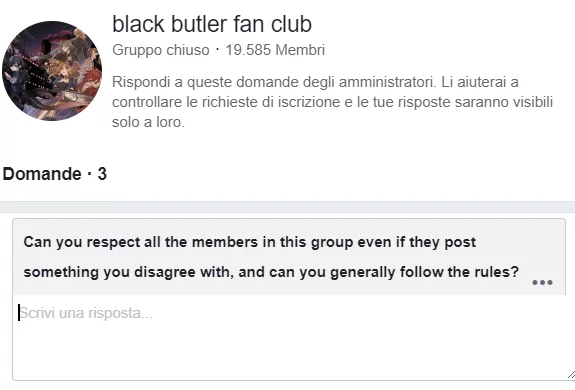During my research on Facebook, I came across only a few closed groups, one of which is black butler fan club. Before I could become a member, I was asked to answer questions about the anime Black Butler (igure 5). After submitting my answers, my request was accepted in a matter of minutes.