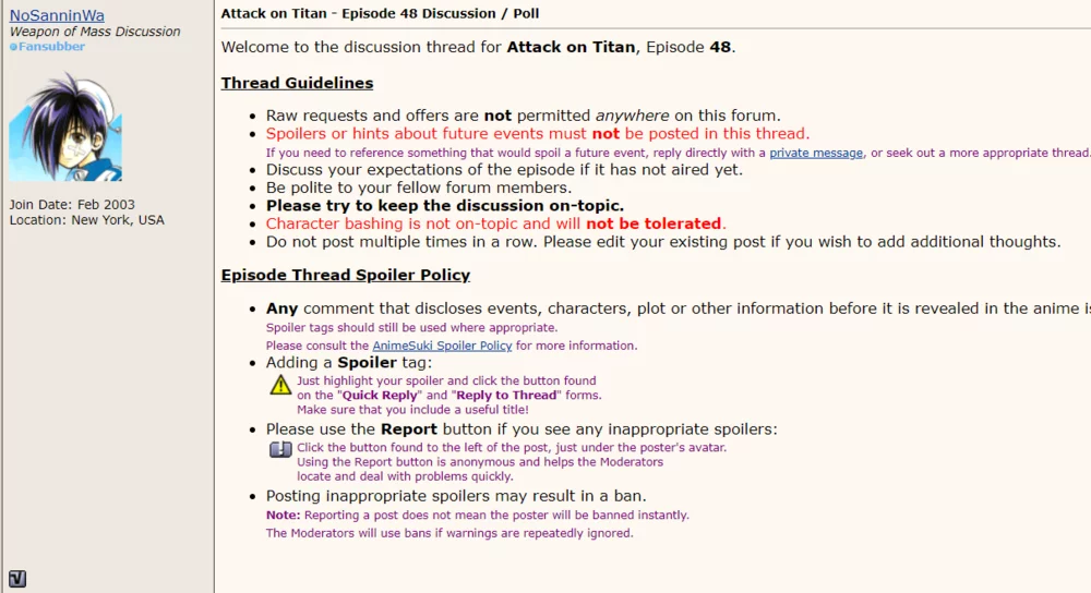 On these websites, people can come together to discuss their favorite anime in a very detail manner. Discussions can be about one episode of a series at a time, as it happens on AnimeSuki Forum or Naruto Italian Forum. There is also a hierarchy of users: the administrators usually set some rules for the proper use of the platform. (figure 3 4) The most popular ones are: no spoiler, and keep the discussion within the theme selected.