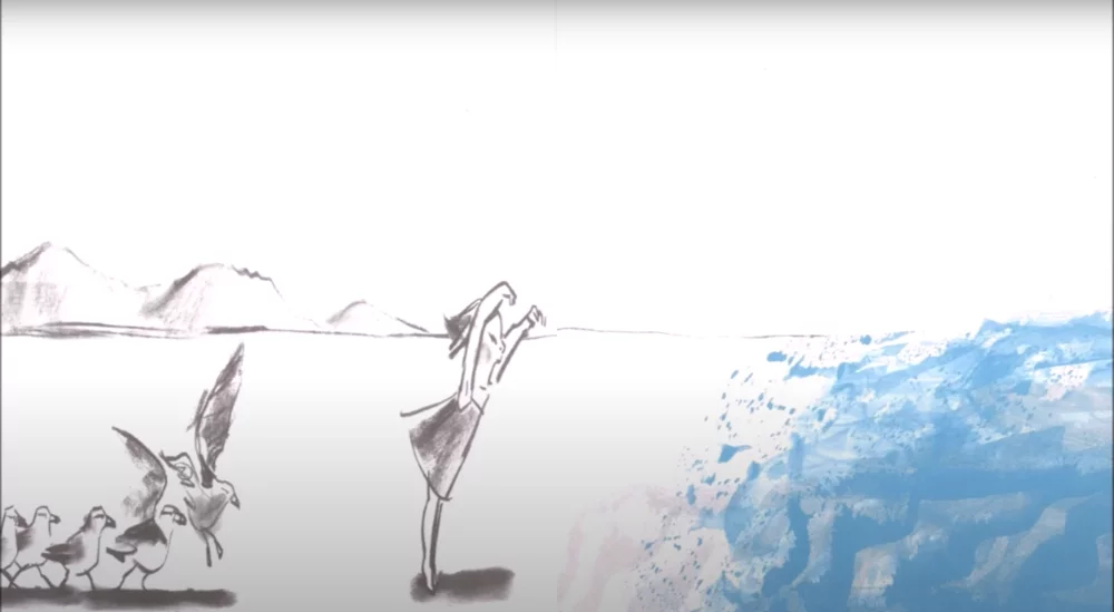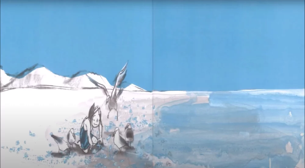 Finally, unlike the previous pages where the wave couldn’t cross the border, it now travels across the line in the middle, splashing its water everywhere (see figure 4). This instance, which breaks the rhythm of the story, invites the readers to carefully consider what it implies. The image again shows the power and the rights of nature, deconstructing not only instrumentalization but also refusing human expectations and stereotypes regarding nature. After the splash, the border that divided the girl and the wave is demolished. Now, the two are united. The wave has left a girl with the blue seashells to look at, and has also changed the color of the sky and the girl’s dress. The fact that both are now blue represents the interconnectedness between humans and nature. This emphasis of the interconnection provides the foundation for the understanding that humans and nature cannot be considered as separate.