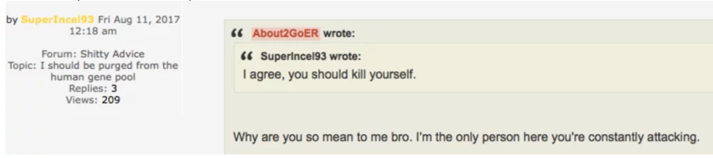 The following example (Figure 3) displays an example of someone from inside the group (named SuperIncel93) judging About2GoER on the basis of his confession by saying ‘GTFO MY HOUSE,..’ In doing so, he verifies that About2GoER does not belong in this group and gets the instruction to leave the house – the user perceives this (online) community as his house, emphasizing the importance the online community has for him. Although he is told how to behave and improve himself, the interaction shows us he did not fit in.