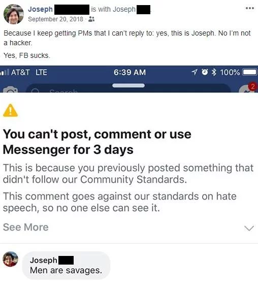 In September 2018, many of us got a new Friend request from Joseph, under a different profile name. As the group were quite vigilant about fake accounts, Joseph took it upon himself to clarify, by posting from his new account to the wall of his primary - but now frozen - account. He shared a screenshot of the notification he had received from Facebook, that his primary account was locked for three days “because you previously posted something that didn’t follow our community standards.” (Image 1). They provided a citation of his violating statement below this announcement, which was “Men are savages.” . According to the moderation guidelines described above, “men” fall under a protected category because the label falls into the category of gender and sex characteristics. For his post to have been in violation of Facebook’s community standards, either an algorithm flagged this token or someone had reported Joseph’s post to the Facebook moderators (Joseph was convinced that he had a nefarious Friend who was flagging his comments), and then a moderator must have reviewed it and decided that such a post merited punishment. Joseph wrote above his screenshot of the account suspension notification: “Because I keep getting PMs that I can’t reply to: yes, this is Joseph. No I’m not a hacker. // Yes, FB sucks.”