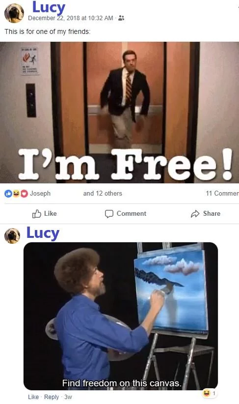 A week later, as soon as Joseph was “freed” (that is, his account was unblocked so that he could use it again), Lucy wrote, “Joseph is BACK!!” (Lucy, Personal, December 29, 2018). In the first comment below Lucy’s post, Samantha wrote: “So, who’s starting the ‘Joseph got banned again’ pool? I’ll take January 3rd.” After several sardonic posts from various Friends, Joseph replied: “Your faith in me is astounding. lol” A short gif thread ensued to continue the game.