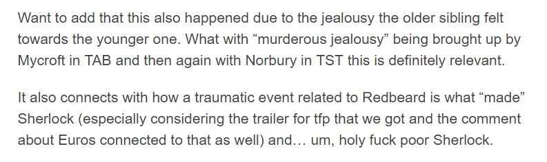 The post not only adds information to the argument made by the other user, but also uses the original post to connect even more parts of the storyline with one another. Additionally, the posts show that not only knowledge about Sherlock and the fan interpretations surrounding the series are important, but that being informed about the original Sherlock Holmes stories is part of being a TJLC’er as well. The second post also demonstrates my earlier point about acronyms playing an important role in the community; in order to understand what this user is trying to say, one needs to know that ‘TAB’, ‘TST’ and ‘tfp’ all refer to episodes of the show (‘The Abominable Bride’, ‘The Six Thatchers’ and ‘The Final Problem’, respectively).