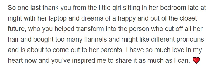 One member of the TJLC community in particular has grown to become such a master. This person, who I will call ‘B’ here for privacy reasons, has become well-known for creating a series of YouTube videos, in which they explained the various topics surrounding TJLC, such as symbolism and subtext, but also references to other Sherlock Holmes adaptions and the beginnings of the TJLC community. B’s work and conversations about sexuality meant enough for fellow TJLC’ers that a Tumblr page was created in order for people to thank B. These posts often include personal stories, such as the following one: