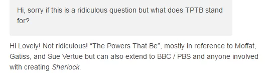 Here, someone involved with TJLC, or at least interested in the community, asks another member about the meaning of an acronym (TPTB) that is used. This illustrates the importance of having knowledge, because without this knowledge, the person asking the question wouldn’t be able to understand discussions surrounding this topic, and would thus be unable to join them. Moreover, the answer that they get requires a certain understanding as well; someone who has been involved with the fandom for a longer time will know that Moffat and Gatiss are the writers of the show, and that Sue Vertue is the producer, but newcomers in the community might have to do some more research after this answer.