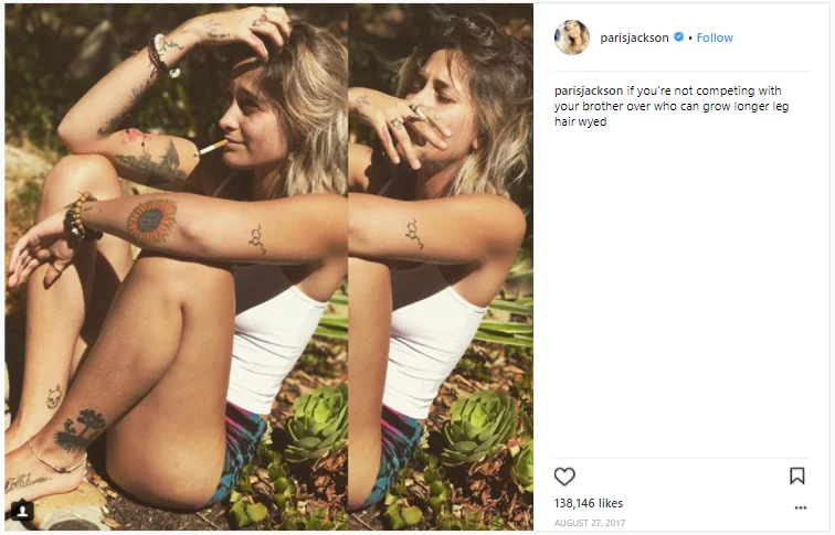 It was this connection between very small details of the body and large issues of public concern that brought in the specific group of public individuals we call ‘social influencers’. Paris Jackson, Michael Jackson’s 19-year-old daughter, and a model, is a particularly active voice regarding this topic. Not only does she frequently post pictures with her body hair on display, but she has also spoken publicly about body positivity. This term usually refers to women accepting their bodies as they are even if this meansgoing against the standards imposed by the media. In an interview for i-D in August 2017, Paris said that
