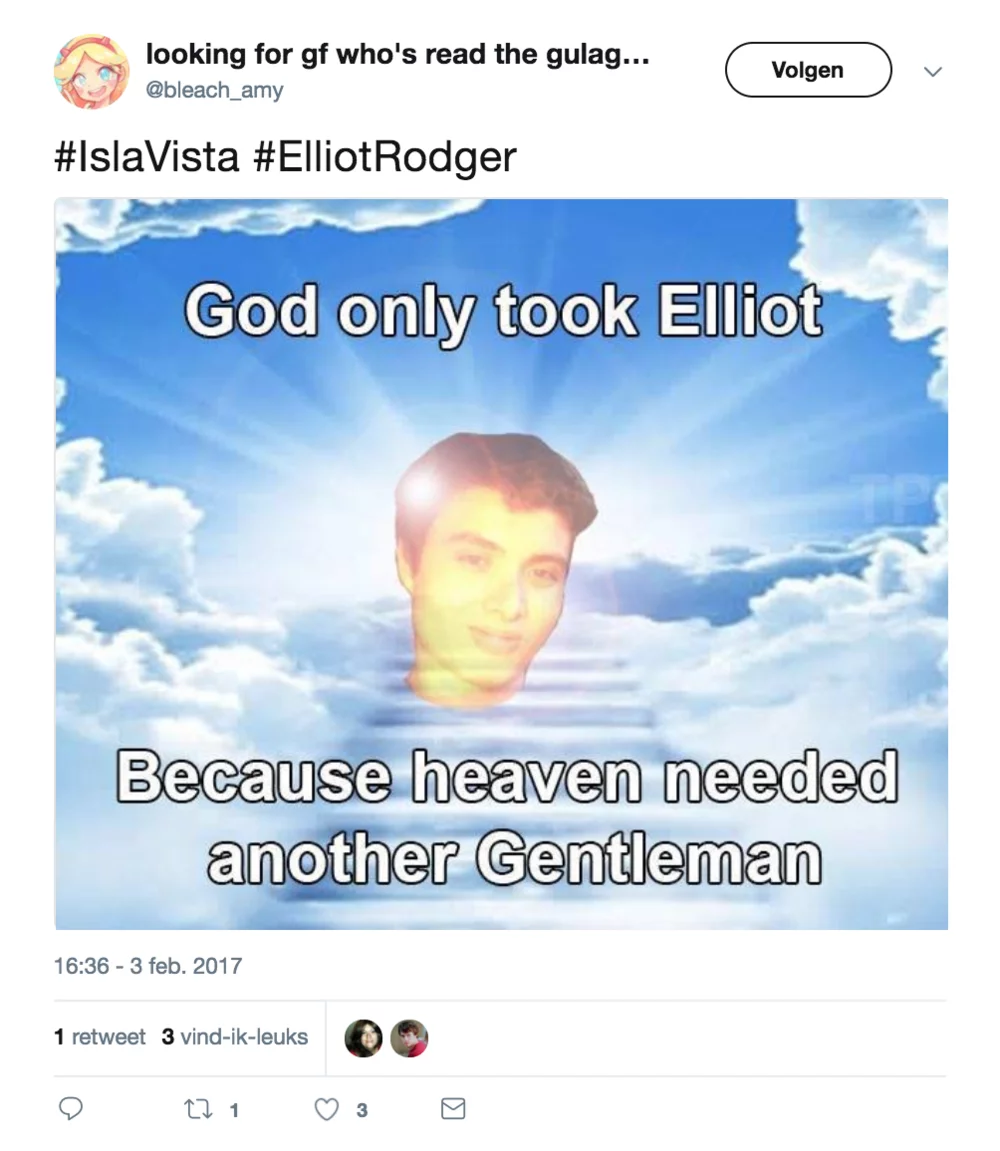 Moreless (2014, 24 mei). Elliot Rodger shoots up California campus because he can't get laid [Forumpost]. Geraadpleegd op 30 november 2017, van https://www.rooshvforum.com/thread-36406-page-62.html