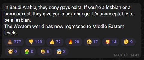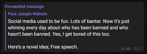 I will focus on the first one, Telegram, because he has a higher engagement rate there, both from supporters and fans (mostly) and detractors (to a lesser extent). Yet he posts exactly the same content on all of his channels.