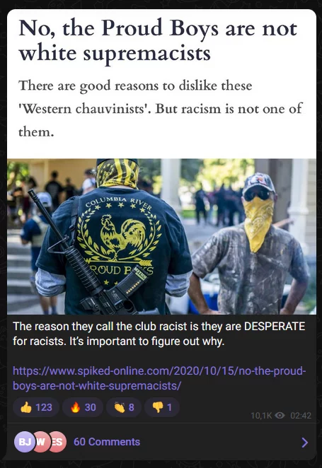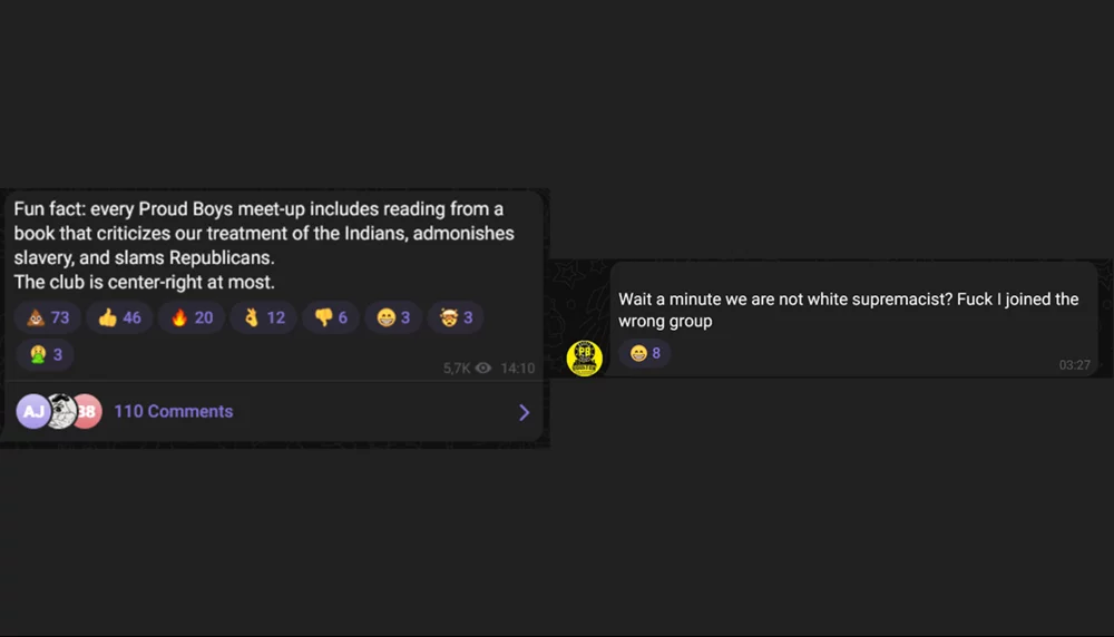 It is essential to point out that this makes sense in his ideological book. As a radical ethnocultural nationalist, it is logical to consider the Proud Boys as not racist (“neutral”) and affirm that they are not right-wing enough. At the same time, if we take a look at the uptake, we can see that some of his followers claim proudly that they are racist/white supremacists. This explains, in a way, why he has been criticized as being weak and light. The conflict is a double-edged sword for him. It is first and foremost culture that matters to him, so everyone embracing American values and culture as superior is welcome.