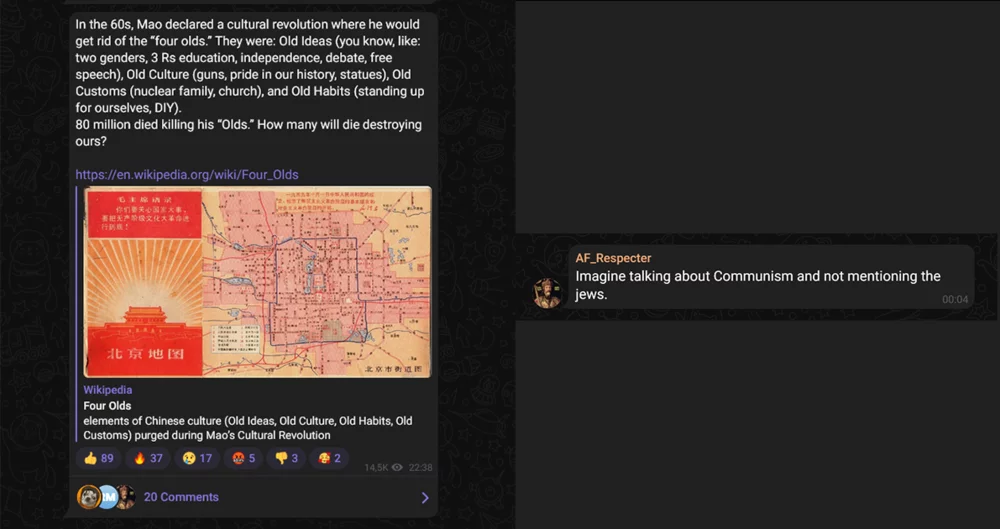 If we take a look at the uptake, then, we can see that he stokes fires without encouraging them. He never participates in the comments section and never explains or corrects his jokes in Telegram. This has two consequences: first, he can be up to interpretation, which allows his users to feed back their thoughts, and at the same time that also allows him to have more users, which helps him to normalize his ideas.