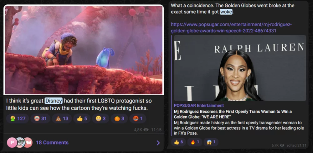 The so-called 'woke ideology', he explains (2022, p 735), is described as “destructive, totalitarian, divisive, negative and anti-democratic”. In these two posts, we can see how the 'woke', on this occasion trans people and LGBT characters, destroyed both the Golden Globes and the 'purity' of Disney. The ‘neutral’, thus ‘non-ideological’, for McInnes, is then the white Western man and the neoliberalism. He never treated these discourses as ideological.