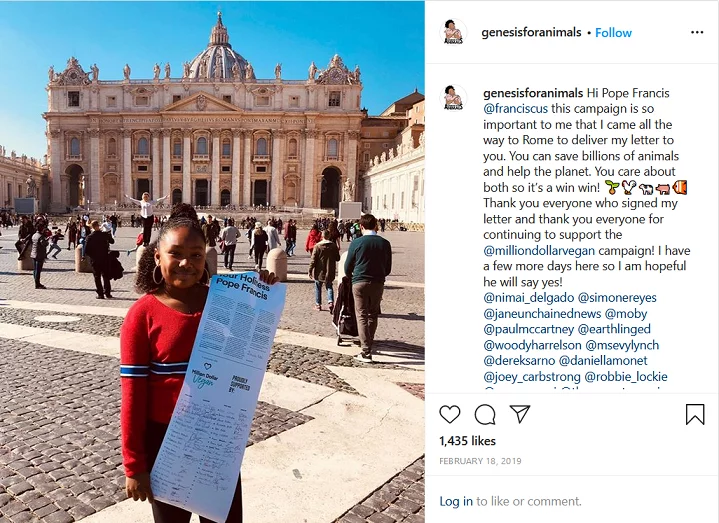 In 2019, she wrote a letter to the Pope asking him if he would go vegan for Lent. Together with the non-profit organization Million Dollar Vegan, she campaigned, both online and offline, to collect signatures under her letter to the Vatican. Ultimately, the Pope said ‘no’ but her vocal campaign earned Genesis Butler even more recognition within the animal rights community.