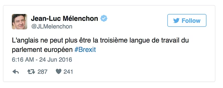 Above, a texto from the Left Party's Jean-Luc Mélanchon reads, “English can no longer be the third working language of the European Parliament #Brexit.” (Mélanchon knows Brexit is an English word, yeah? As are both texto and its synonym, SMS.) Right-wing French politicians expressed similar views.