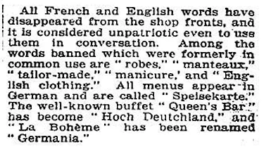 Above: Linguistic cleansing in 1914 Germany: All French and English words have disappeared from the shop fronts, and it is considered unpatriotic to use them in conversation. . . . The well-known buffet "Queen's Bar" has become "Hoch Deutchland," and "La Bohème" has been renamed "Germania."