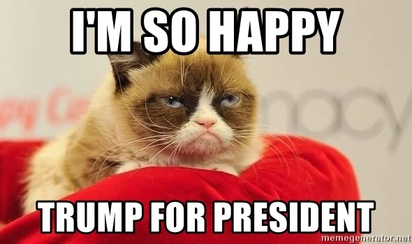 An example of someone having created a LOLcat to participate in the debate on these 2016 Presidential Elections can be seen in Figure 2. Here we see a picture of the famous Grumpy Cat, with the text ‘I’m so happy Trump for president’. The combination of the picture of the grumpy cat and the text, for which borrowing and mixing from other sources, or bricolage and poaching, is used, make it a sarcastic meme, stating that this creator is actually really not happy with Trump being a candidate for the presidential elections.