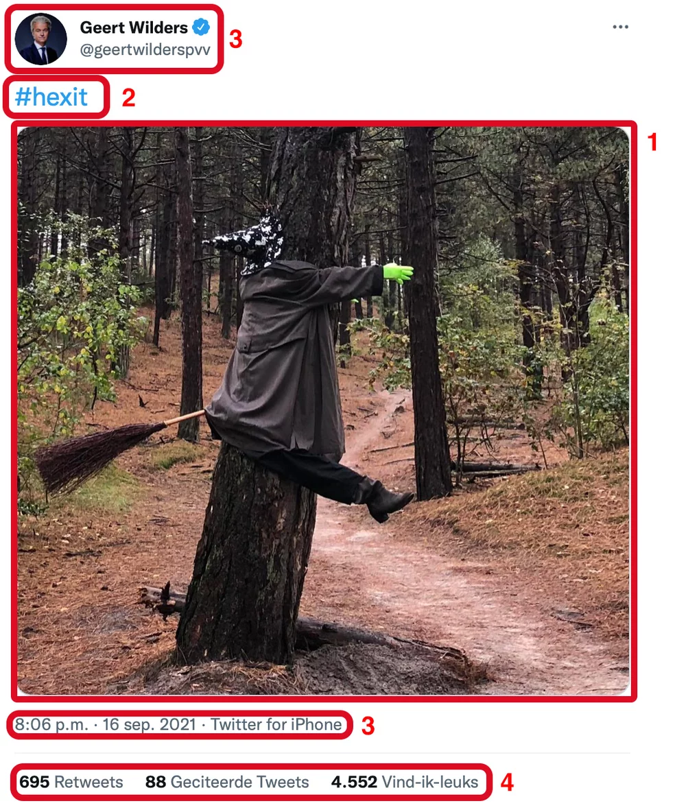 The subject of my analysis will be a tweet posted on September 16th 2021 by Dutch right-wing politician Geert Wilders. In Figure 1 (a screenshot taken on October 8th 2021) we encounter different modes of communication. The most prominent is the image of the witch-puppet that is composed in such a way that it looks as if it flew against a tree (1). Another prominent mode is the text Wilders wrote as caption: “#hexit” (2). Other modes that can be found in the data are the metadata of the post (3) and the metrics that indicate the uptake of the post (4). These metrics – 695 retweets, 88 cited retweets, 4.552 likes – are quite high, indicating that Wilders reached a lot of people and generated a lot of uptake with this tweet.