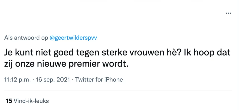 But not everybody replies in agreement. There are also replies voicing critique on Wilders, calling him “a cowardly phthisis dog” (Figure 5), and calling his tweet “a representative of the people unworthy”(Figure 6). One person even interprets Wilder’s tweet as indexing his inability to deal with strong women (Figure 7). Even though these replies are negative towards Wilders, they might actually play into his hands, considering social media logic (Van Dijck & Poell, 2013). By replying to his tweet, these Twitter users actually increase the reach of Wilder’s tweet, amplifying the very narrative of ‘Kaag the witch’ they oppose.